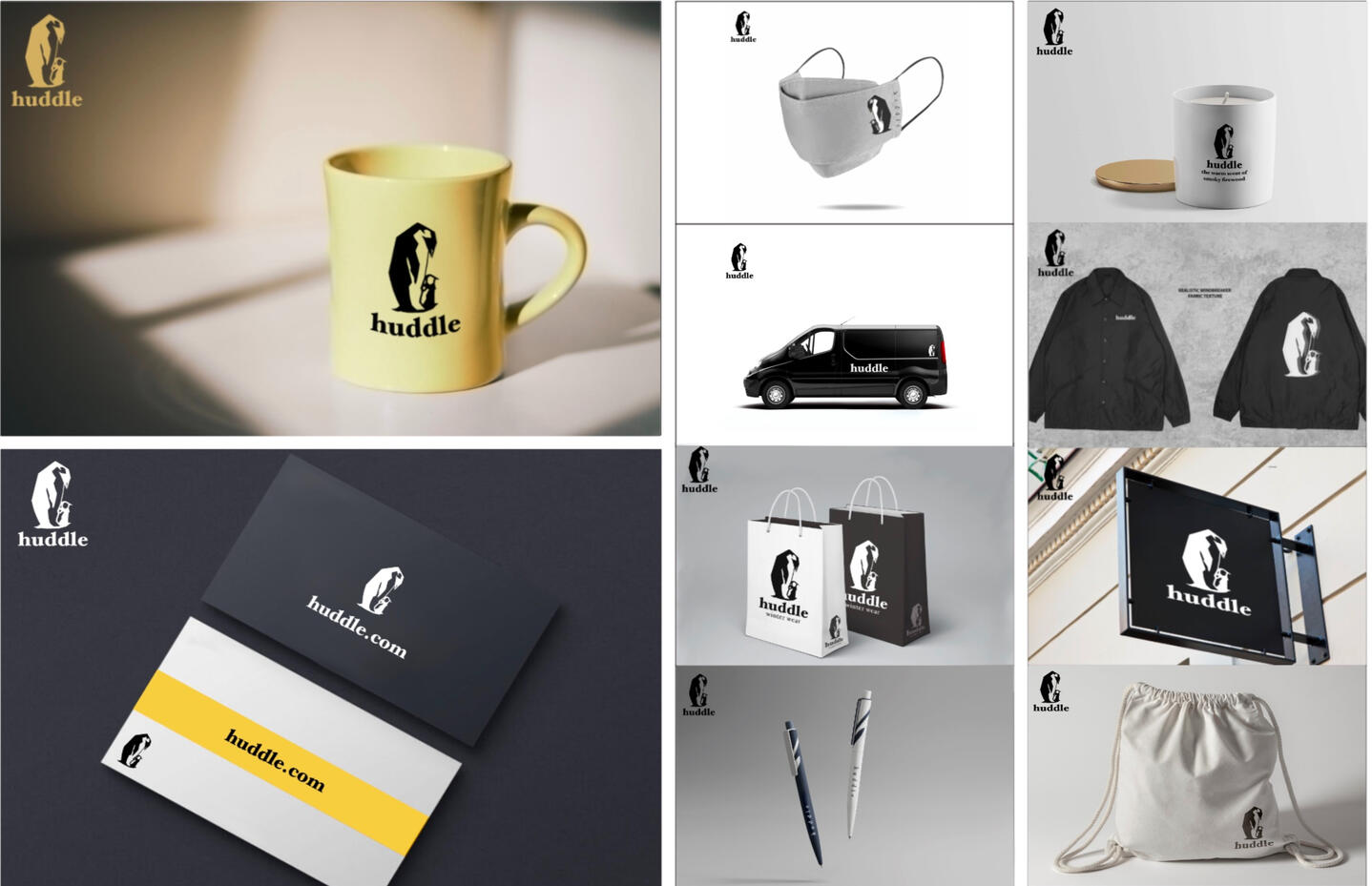 MOCKUPS: branding and merchandise gifts including the Huddle brand including jackets, masks, delivery vans, business cards, takeout bags etc.